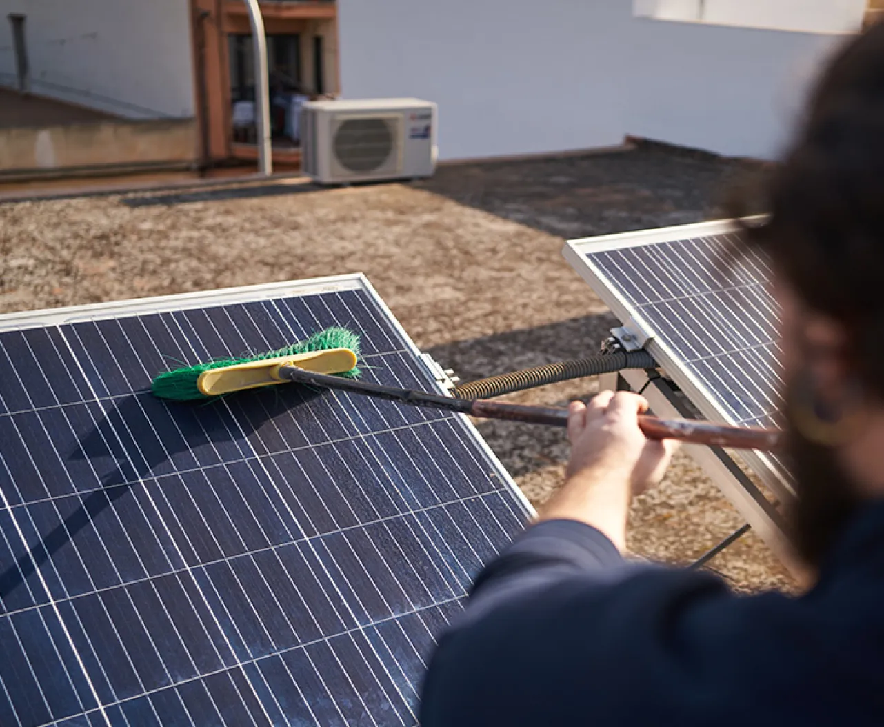 Les personnes suffisamment bricoleuses peuvent effectuer cet entretien elles-mêmes assez facilement. Il suffit de nettoyer vos panneaux avec un tuyau d'arrosage ou un lave-vitre télescopique (évitez le nettoyeur haute pression !) et des produits adéquats (détergent approprié, chiffon ou éponge douce). Vous n'avez pas la possibilité de le faire vous-même (parce que votre toit est difficile d'accès ou dangereux, par exemple) ? Faites appel à une entreprise spécialisée ou à un nettoyeur de vitres professionnel pour l'entretien.